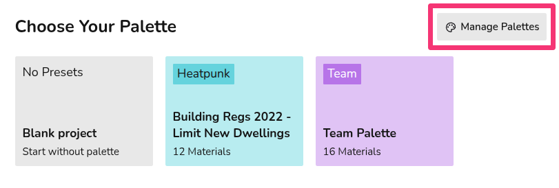 When you create a project, you will see all your complete palettes and the option to create a palette from scratch (No Presets). You can also navigate to the material library from here by clicking Manage palettes.