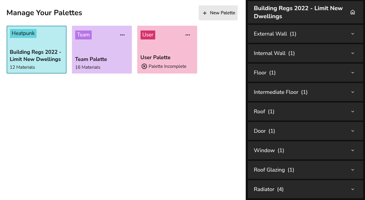 For each Heatpunk project you will need to use a material palette. This palette contains all the materials that make up the property you're modelling. You can create default palettes usable on any projects through your material library or build palettes from scratch for each project.