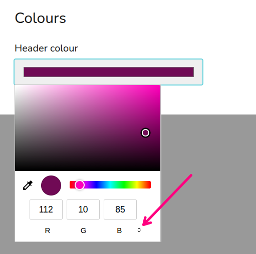 You can precisely match this with your branding colours with the RGB, HSL or HEX code, use the arrows to navigate between these options.