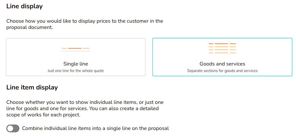 In this section you can configure the quote format. Select whether you would like the quote to display goods and services separately and whether you'd like these sections to display as individual lines.