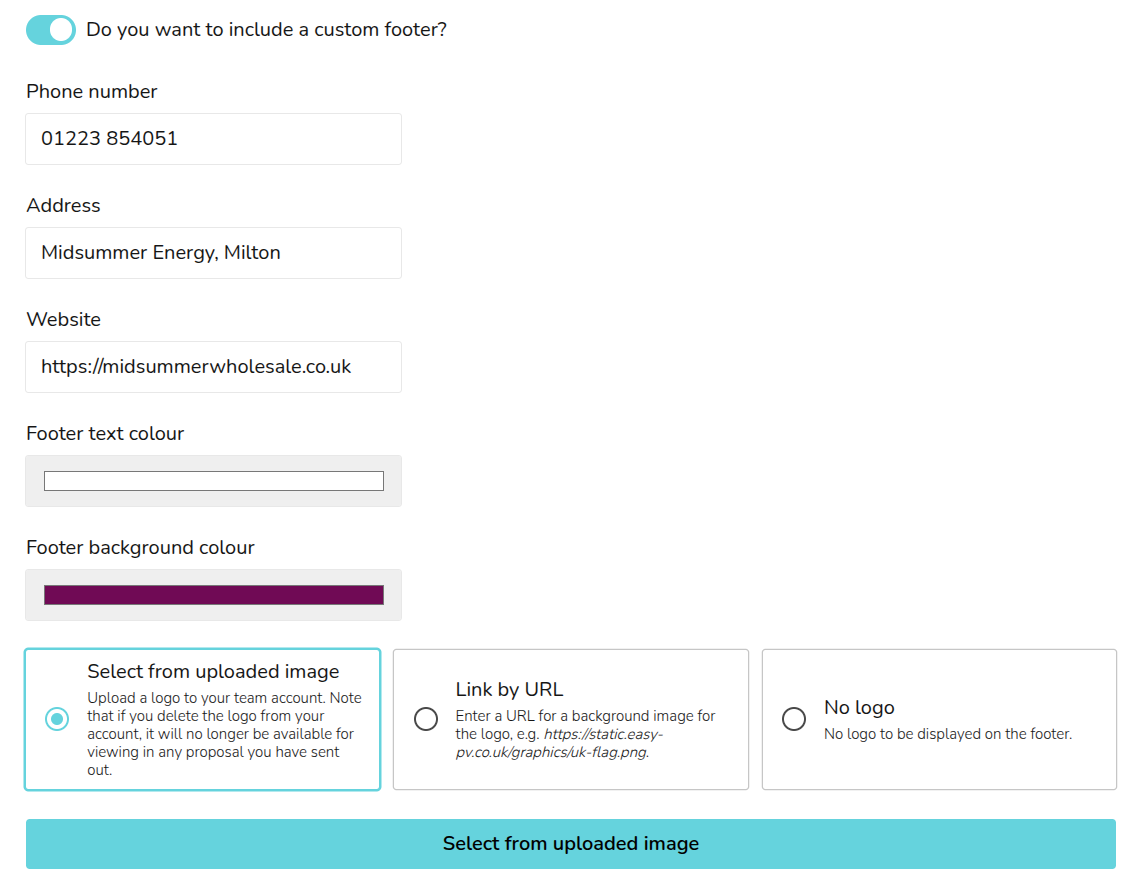 In your custom footer you can input a phone number, address and website. You can also select the footer background and text colour and upload a logo.