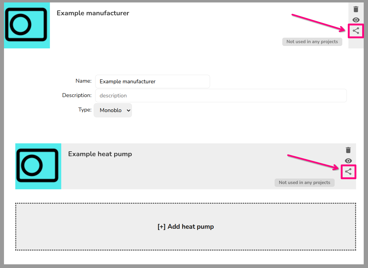 If you are using custom components in Heatpunk, you can share those owned by you with other members of your team. Select My Components from the left sidebar and then select the component type to find the component you want to share. Click on the share icon to configure sharing for the component.