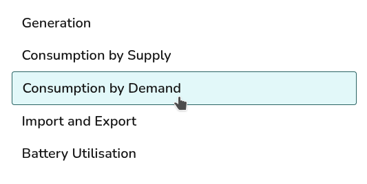 Where solar has not been included Consumption by Supply and Import and Export tabs will not display. Where a battery has not been included, Battery Utilisation will not display.