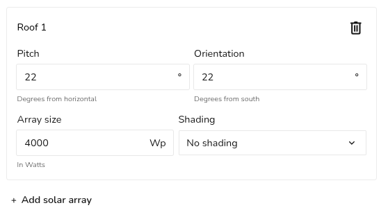 For each roof, input the pitch, orientation, array size and level of shading. Add new solar arrays as necessary.
