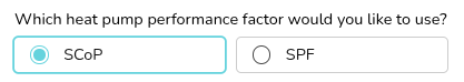 UK users can select here whether you'd like to use the SCOP (based on the heat pump and flow temperature selected in the heat pump task) or the SPF (based on MCS 031 and calculated in the the performance task). For IE users, Heatpunk will use the SCoP.