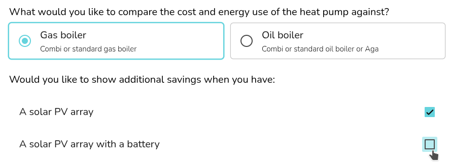 Select what you would like to compare the cost and energy usage of the heat pump against for space heating and hot water. You can also select whether you'd like to factor in a solar PV array and a battery.